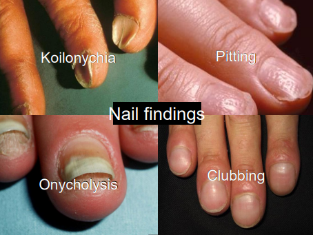 Koilonychia- spoon nails, occurs in iron deficiency anaemia