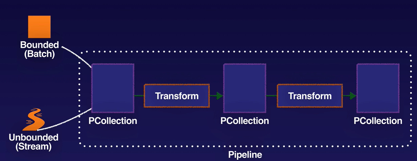 • PCollection: represents a potentially distributed, multi-element dataset that acts as the pipeline’s data. Apache Beam transforms use PCollection objects as inputs and outputs for each step in your pipeline. A PCollection can hold a dataset of a fixed size (bounded, for batch) or an unbounded dataset from a continuously updating data source (for stream).