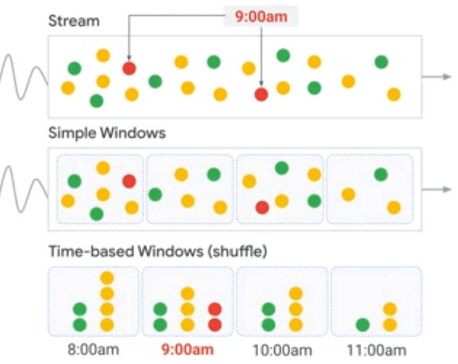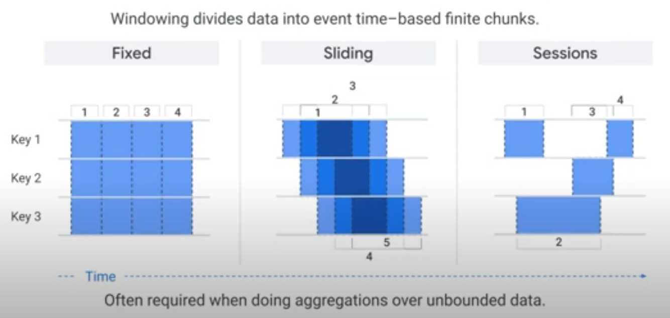 Windowing functions divide unbounded collections (i.e. streaming data) into logical components, or windows. Windowing functions group unbounded collections by the timestamps of the individual elements. Each window contains a finite number of elements.