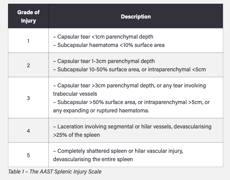 Haemodynamically stable/Grade 1-3: Conservative. Move to high dependency area on strict bed rest and regular abdominal exams for deterioration. CT repeated 1/52 post injury. Increasing tenderness or peritonitis re-image/laparotomy/embolisation. Prophylatic vaccinations on discharge