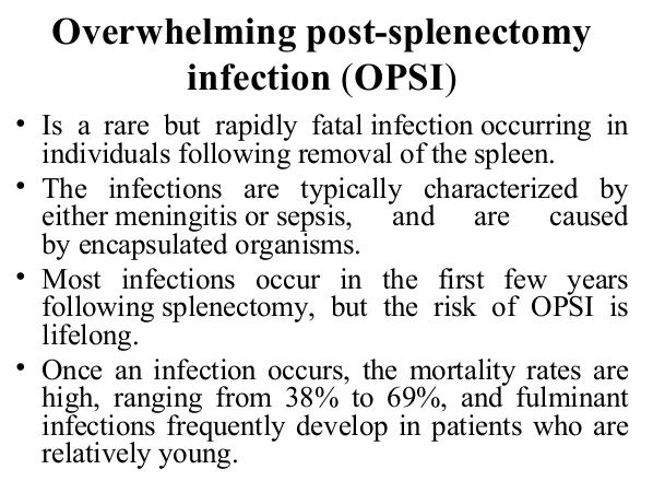 - OPSI so give prophylatic Penicillin V and vaccinations to prevent sepsis