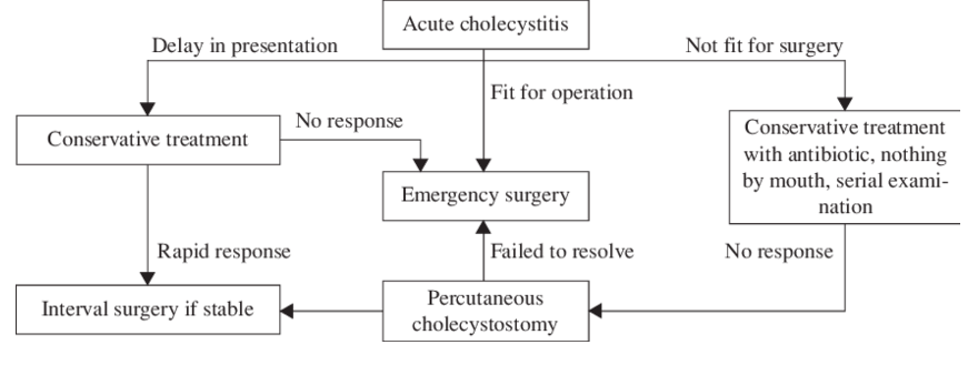 - Percutaneous cholecystostomy if not fit for surgery/not responsive to abx. Drains infection