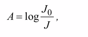base-10 logarithm of the ratio of the perpendicularly incident (J0) and perpendicularly transmitted (J ) light intensity ( log (J0 / J ) ). The three different names are used for the same physical quantity.