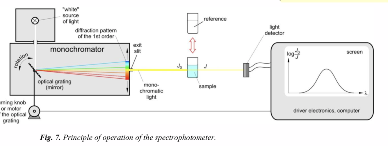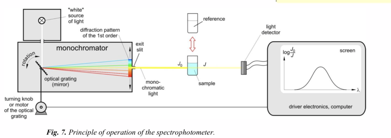In the simple, manual spectrophotometer, the absorbance of the (1)___ and that of the (2)___ are measured separately at every wavelength, which is set manually.