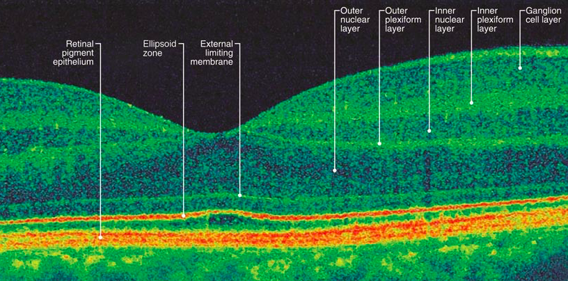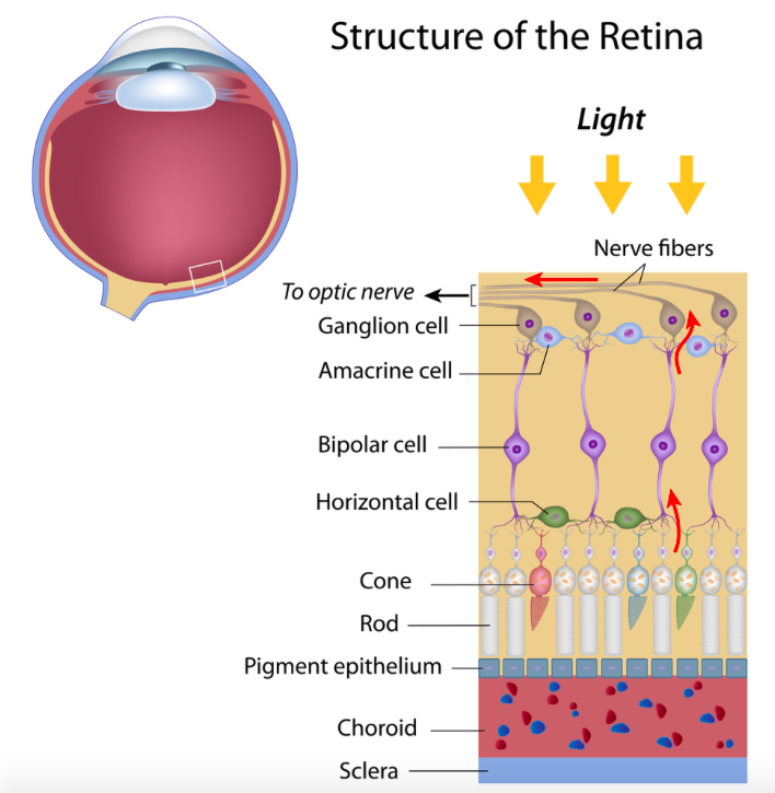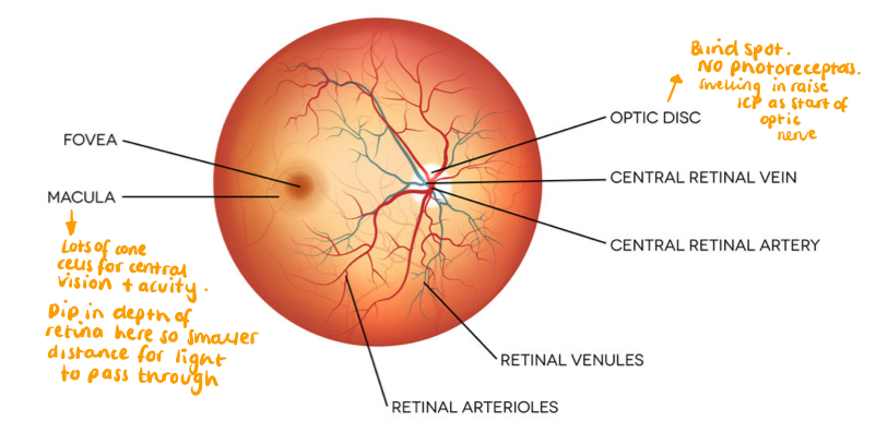 Pigmented Layer: retinal pigment epithelium. contains lots of melanin to ensure no excessive refraction of light rays and stop glare. (albinos don’t have melanin so this is why they struggle with normal light being too bright)