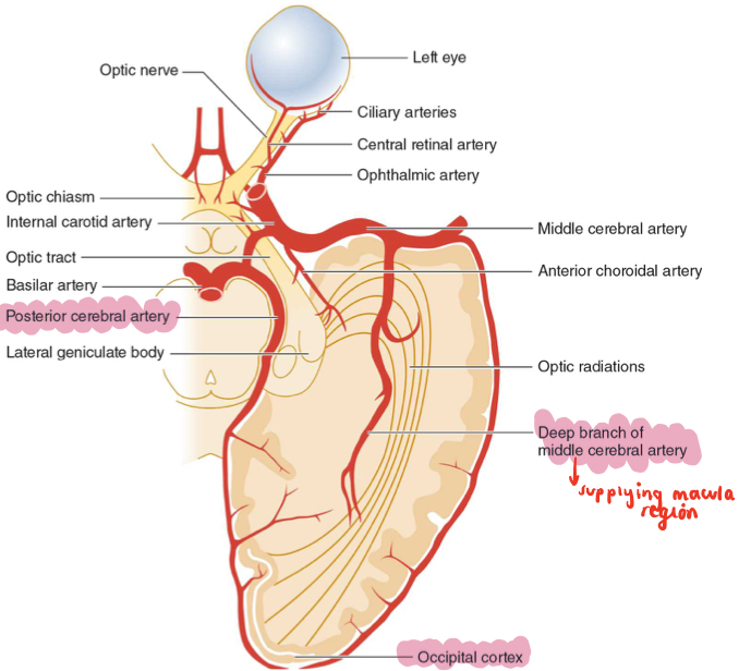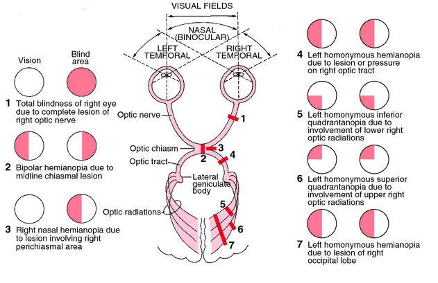 Optic Nerve –> Optic Chiasm –> Optic Tracts –> Lateral Geniculate Nucleus in the Thalamus –> Radiations (superior and inferior) –> Occipital Lobe (primary visual cortex)