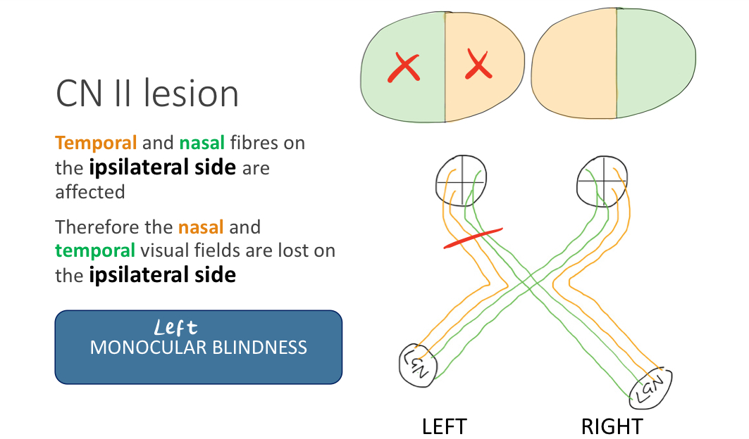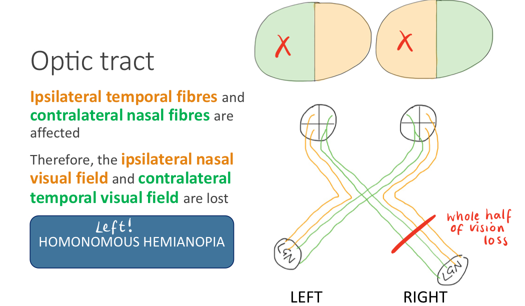 - Lesion in the right optic tract. Contralateral lesion to vision loss, use nasal field loss to guide side of lesion as temporal fibres don’t decussate