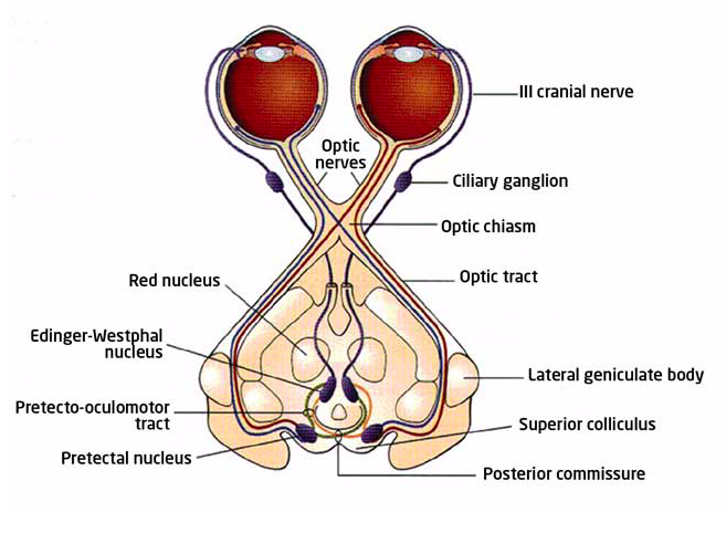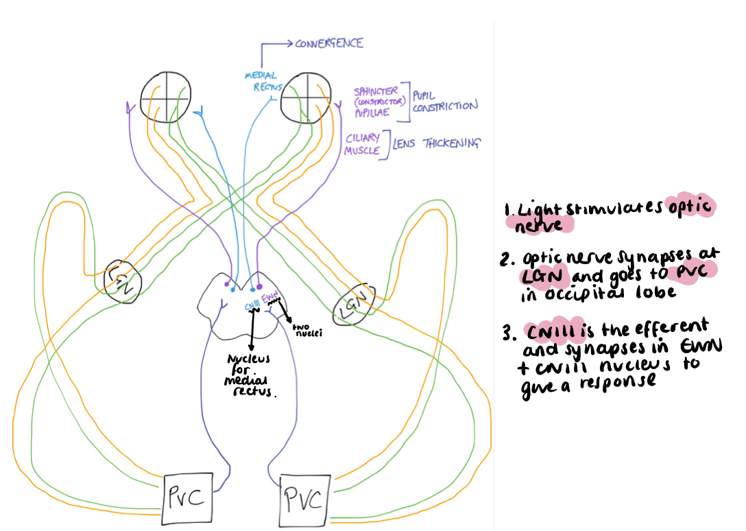 Cerebral cortex involved as well as midbrain as some image interpretation unlike in the light reflex. Occipital lobe sends fibres back up to midbrain