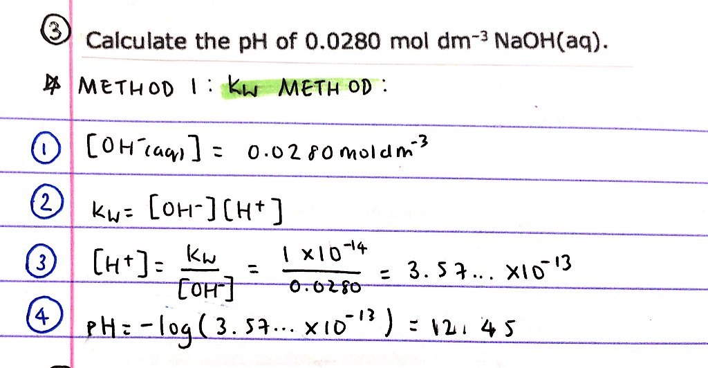 Calculate the pH of 0.0280 moldm-3 NaOH(aq) using the Kw method