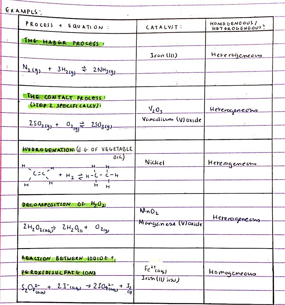 Catalyst = A substance that increases the rate of a chemical reaction by providing the reaction with an alternative route that has a lower activation energy. It alos doesn’t get used up in the process