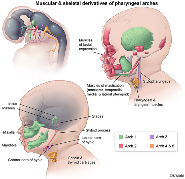 What are the cartilage, muscle, and nerve derivatives of the 3rd branchial arch?
