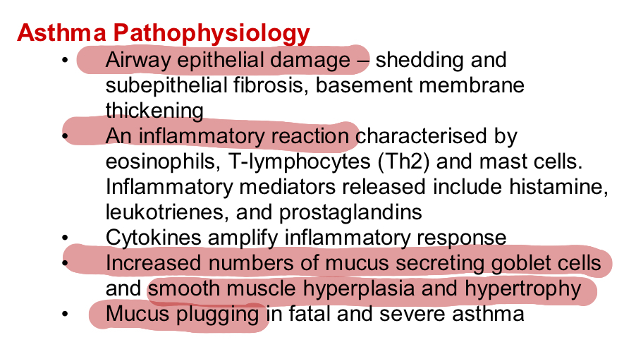 - Airway narrowing: bronchial muscle contraction, mucosal swelling due to mast cells and basophils releasing mediators, increased mucus production