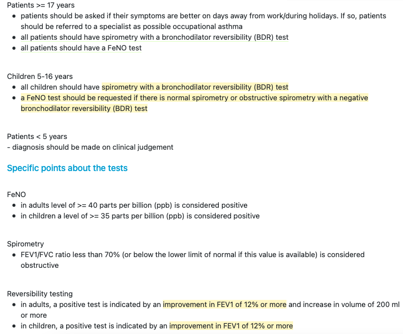 - Spirometry (obstructive pattern, ratio<70% with bronchodilator reversibility)