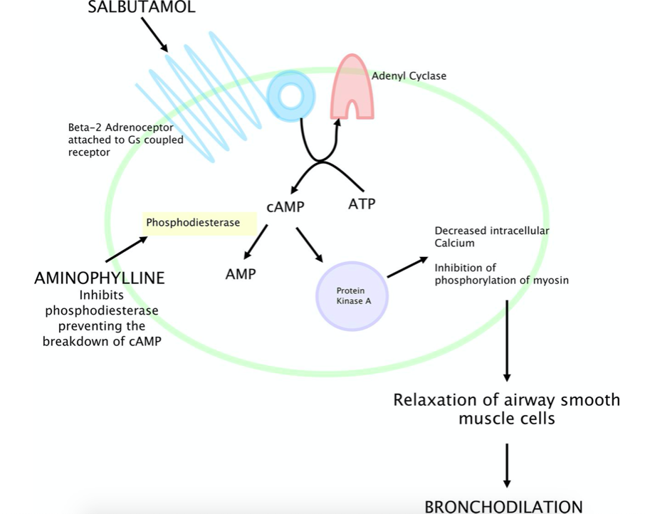 Metabolised to theophylline. Inhibits phosphodiesterase so decreases bronchoconstriction.