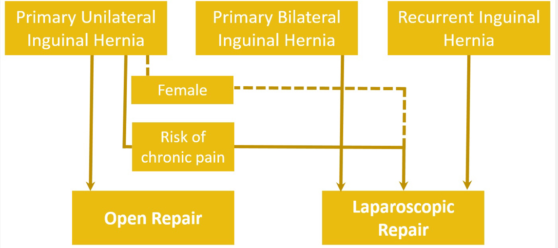 - Laparoscopic: for bilateral or recurrent inguinal hernias or can be used for primary hernia but high risk of chronic pain or females
