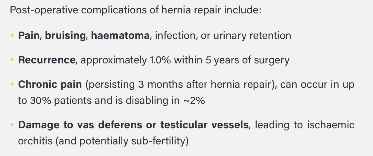 What are the complications of inguinal hernias and post-operative complications for their repair?