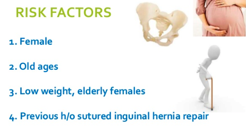 - Risk Factors: female, pregnancy, raised intraabdominal pressure, increasing age