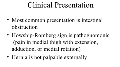 What is an obturator hernia and how will they present?