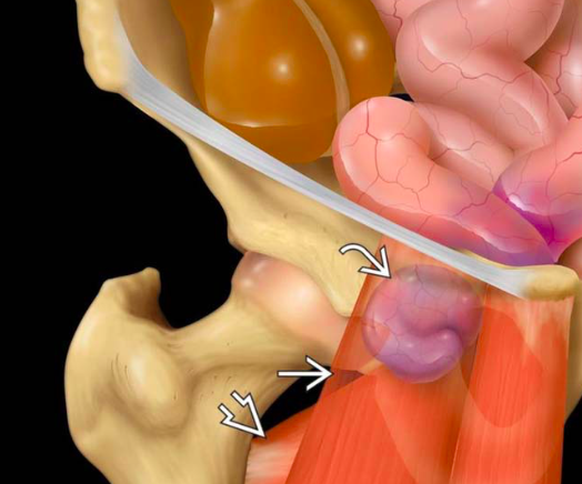 Direct Inguinal (20%) - Go through weakness in Hesselbach’s triangle. More common in older patients due to weaker abdominal wall or increased intrabdominal pressure