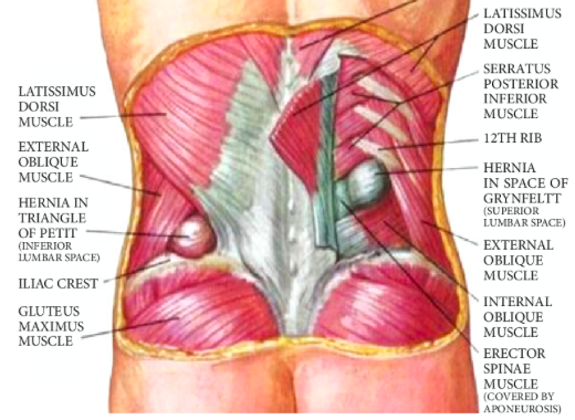 Lumbar: posterior hernia that occurs spontaneously or iatrogenically, posterior mass with back pain