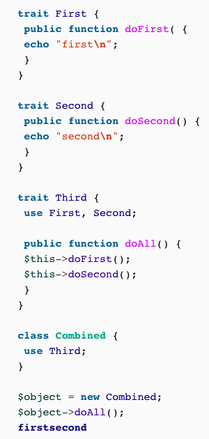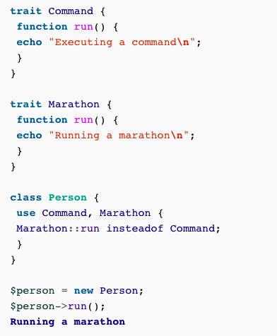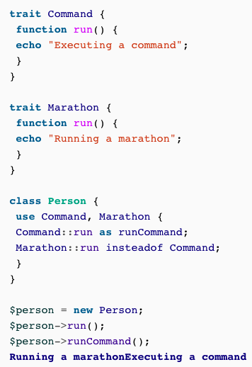 If using multiple traits that define the same method, php compiler will throw a fatal error but you can REPLACE it, how do you do this?