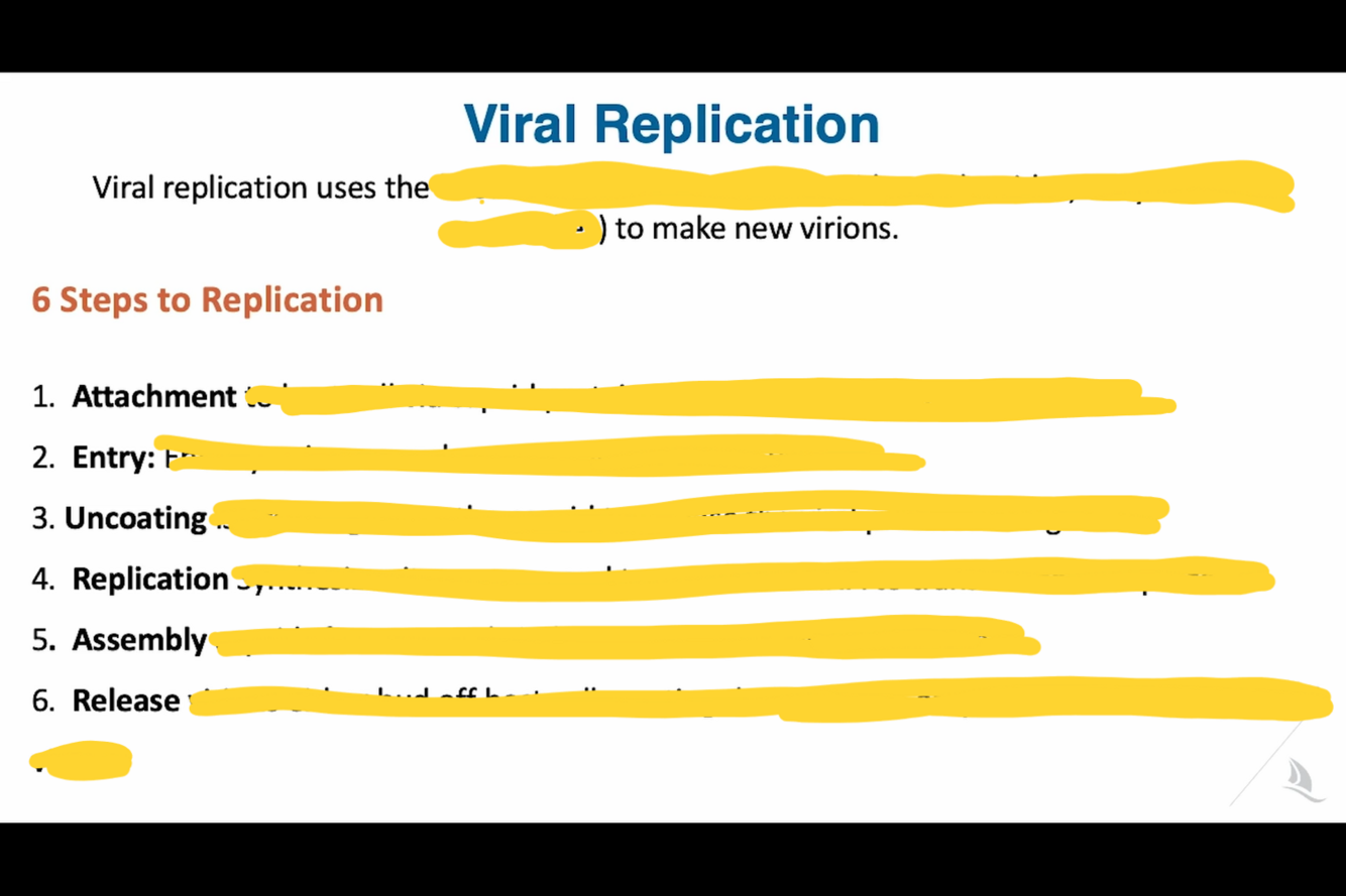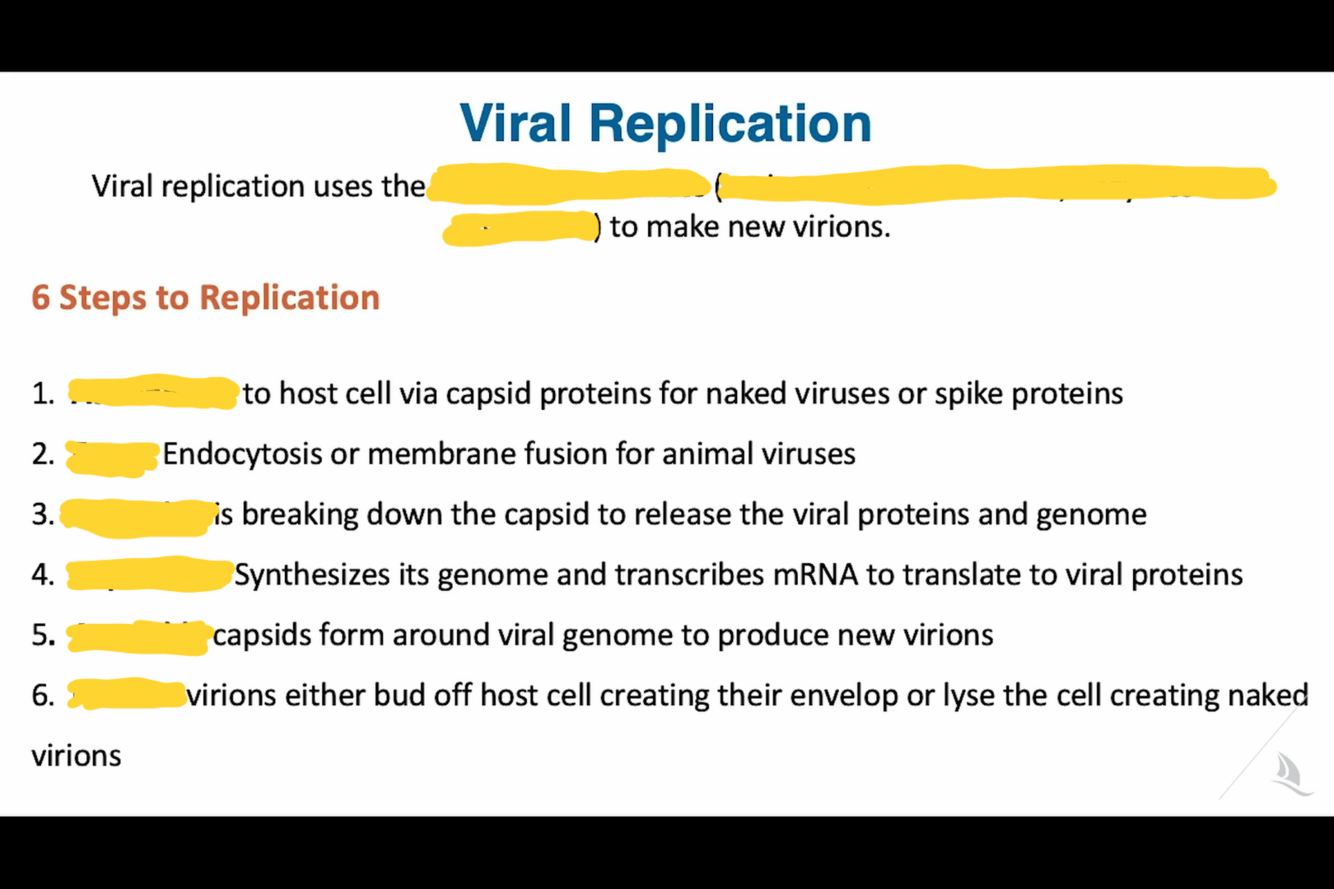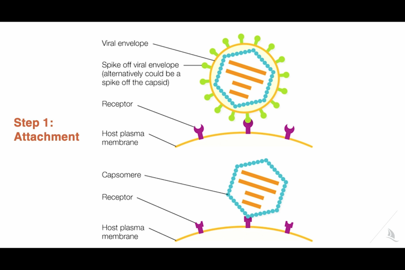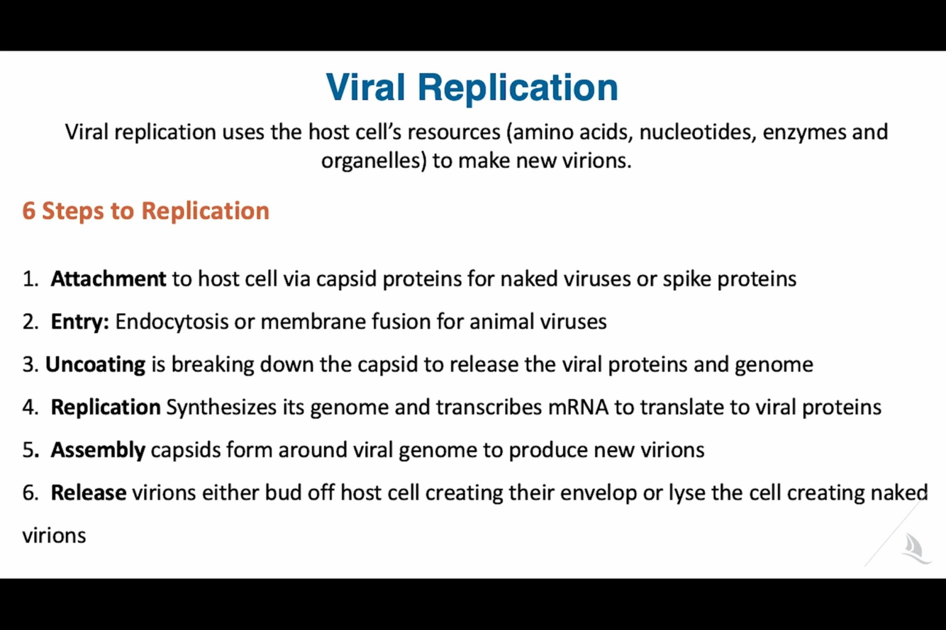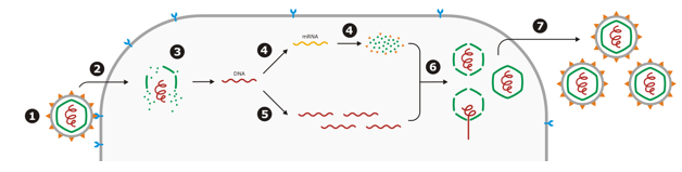 Generalized Viral Life Cycle. The virus must first attach to the host cell (1) and quickly penetrate and enter the cell (2). The capsid disintegrates (uncoating), as it enters the cytoplasmic space (3). The viral genome then undergoes transcription/translation to produce new viral proteins (4) as well as duplicates its entire genome (5). New viruses are then assembled (6) and released (7).