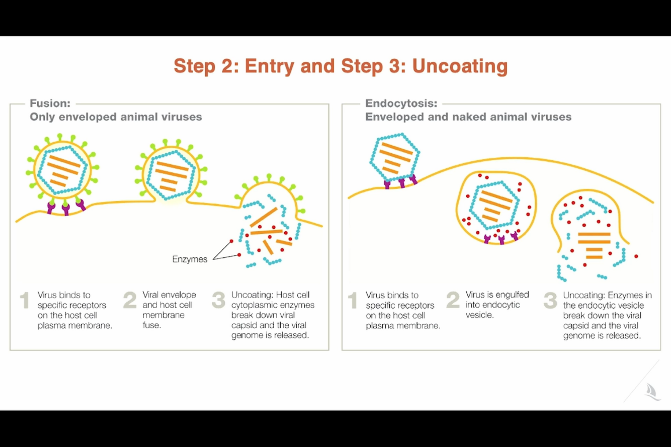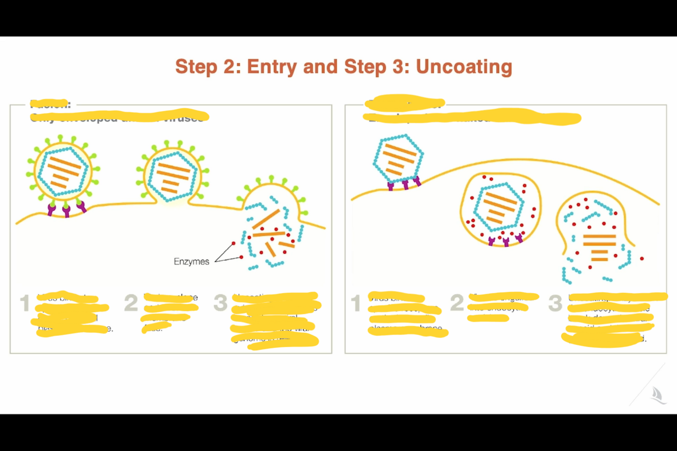 Once the ___1___ enters the cytoplasm, it ___2___ and releases the viral genome into the cell.