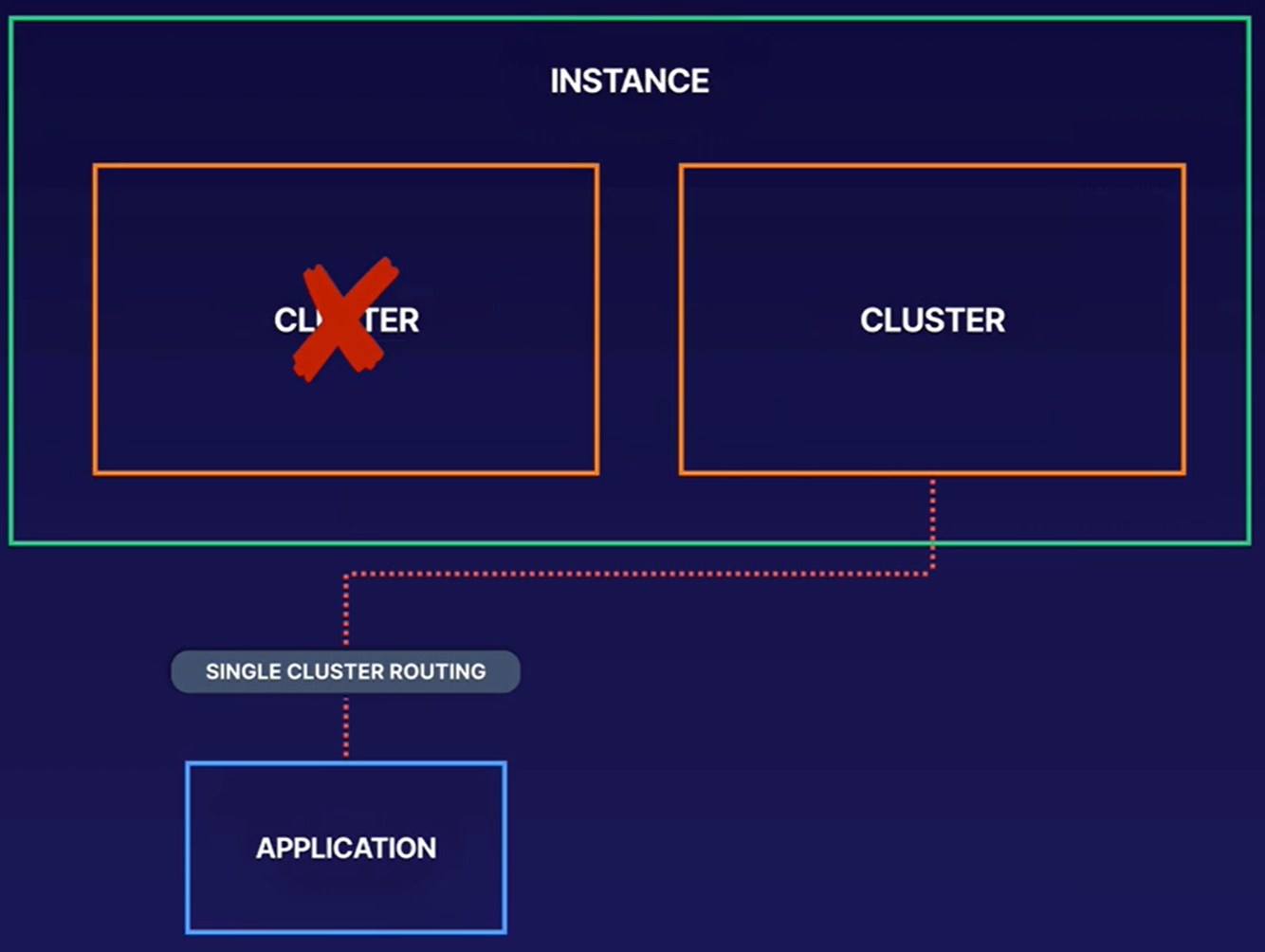 • Single-cluster routing: application will route to a single cluster. Will have to perform a manual failover (manually updating profile) if cluster fails.