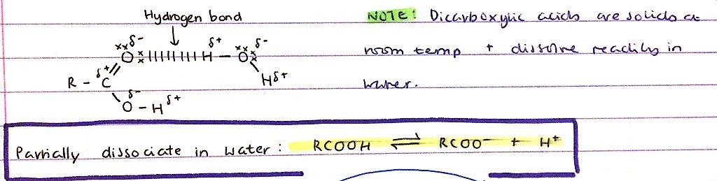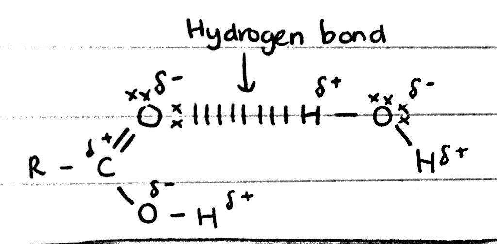 Draw a diagram to show the formation of hydrogen bonds between carboxylic acids and water molecules