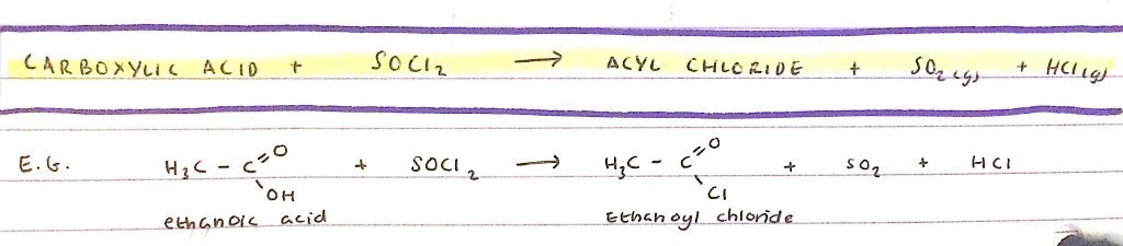 Carboxylic acid + SOCl2 → Acyl Chloride + SO2 + HCl