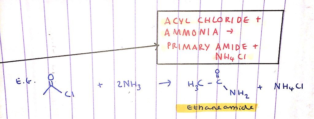 Acyl chloride + Ammonia → Primary amide + NH4Cl