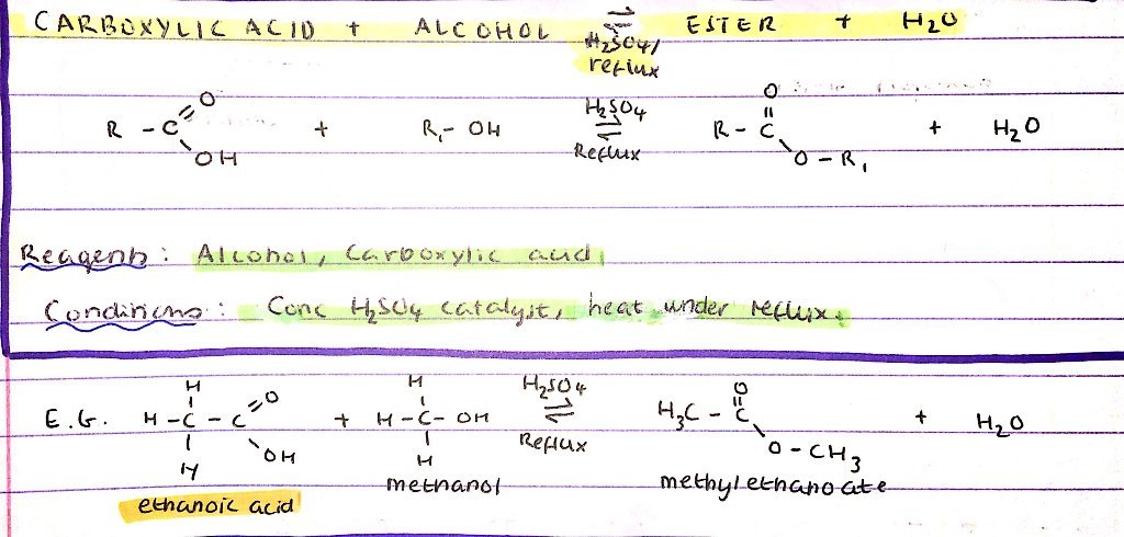 Carboxylic acid + Alcohol ⇌ Ester + H2O