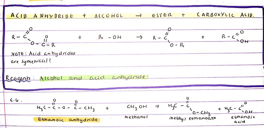 Acid anhydride + Alcohol → Ester + Carboxylic acid