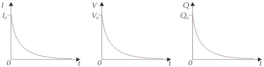 Draw are the graphs for charge, pd, and current for a discharging capacitor.