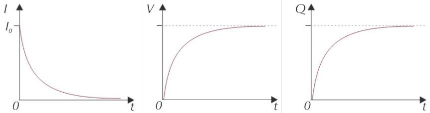 In what proportionality does current, charge and pd of a capacitor decrease?