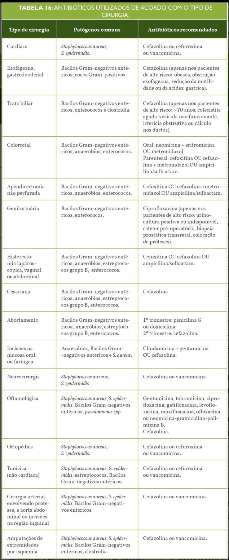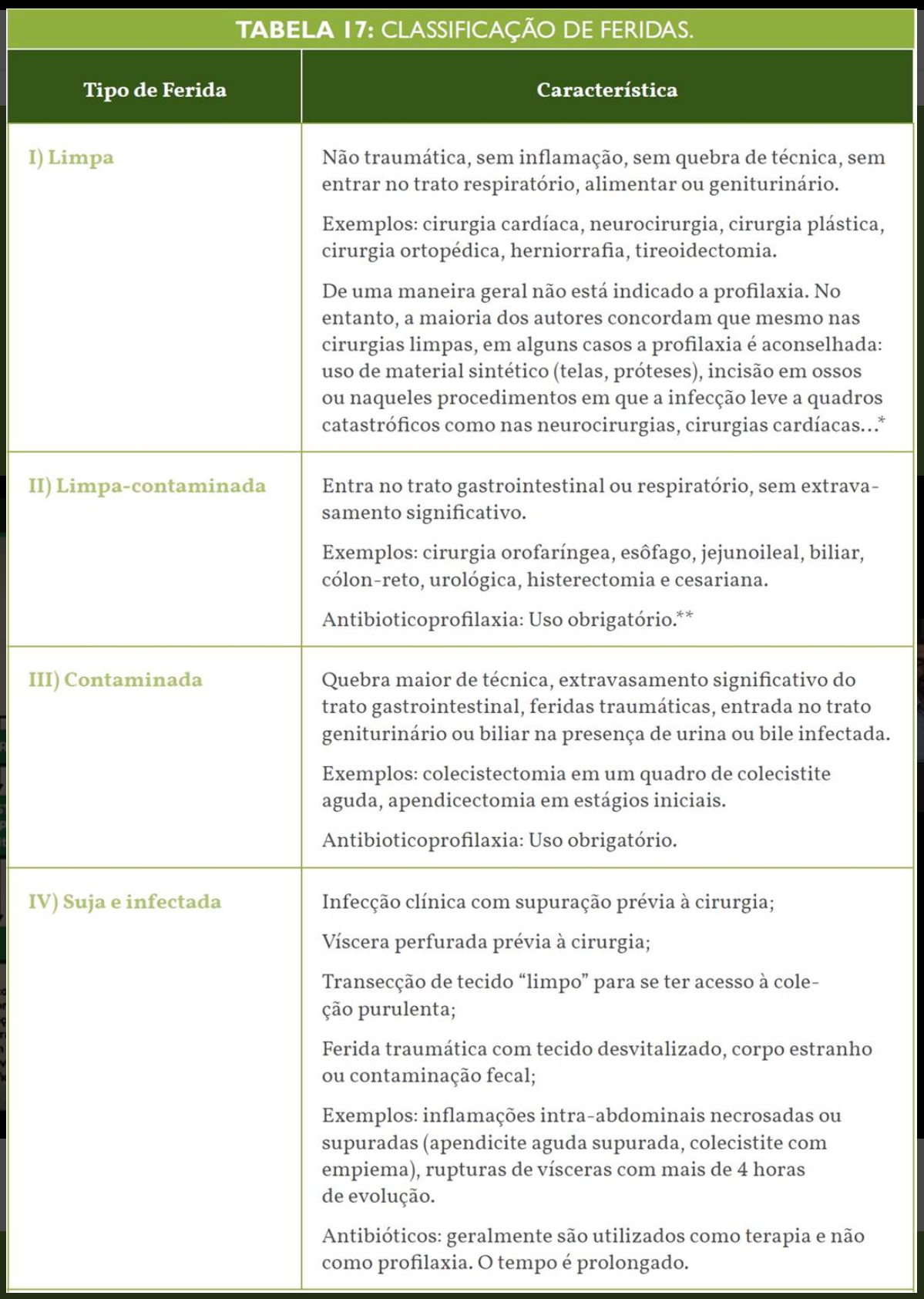 OBS1: Embora seja um assunto que ainda gera discussão, a tendência atual é a relaização de anribiótico profilático nas cirurgias limpas que utilizam telas, como na correção de hérnias inguinais. Álem disso, algumas metanálises sugerem também o uso do antibiótico profilático nas cirurgias de cancêr de mama, em pacientes que não se submeterão à recosntrução imediata.