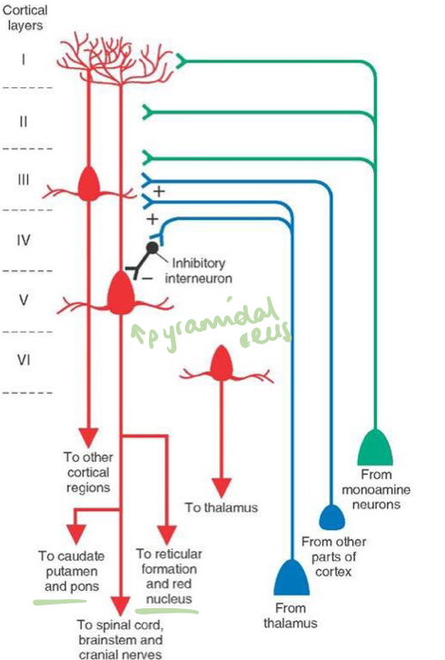 - Output: pyramidal cells and project to wide cell areas (projection fibres via UMNs, commisural fibres via corpus callosum, association fibres like arcuate fasiculus)