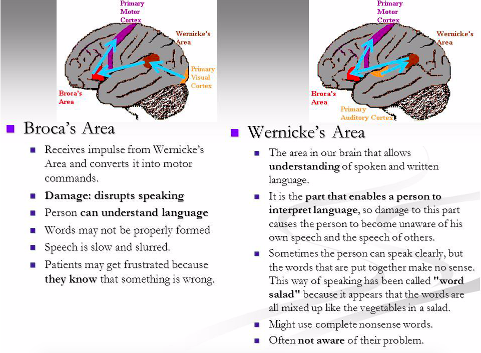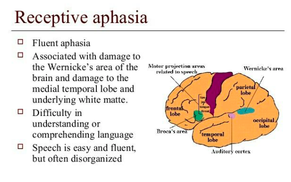 - Wernicke’s understands speech in parieto-temporal area near auditory cortex. Fluent receptive dysphasia if damaged