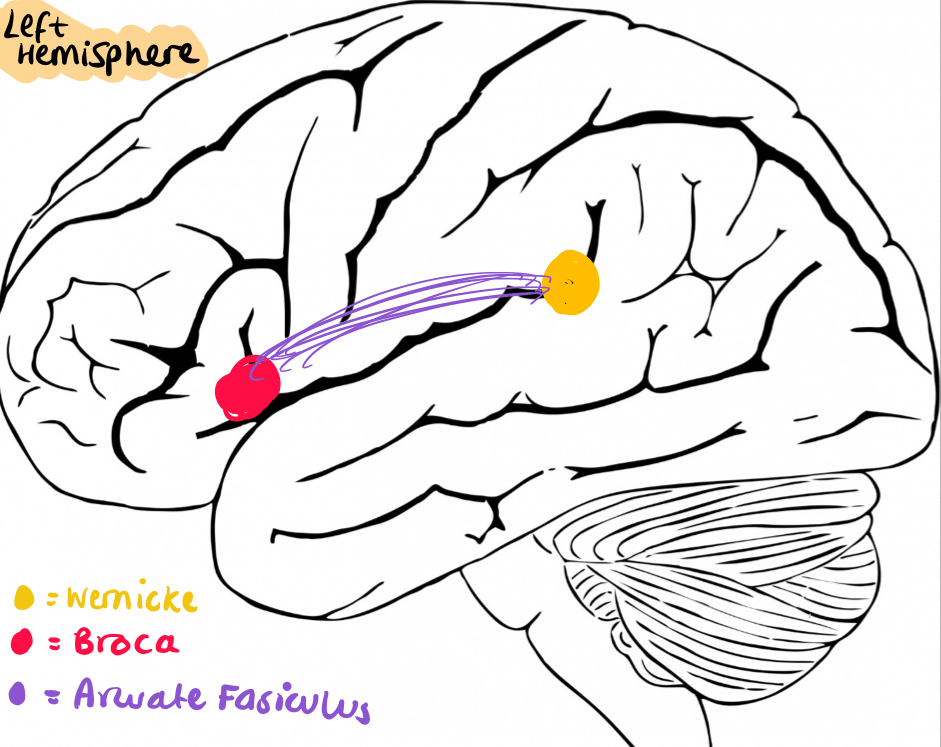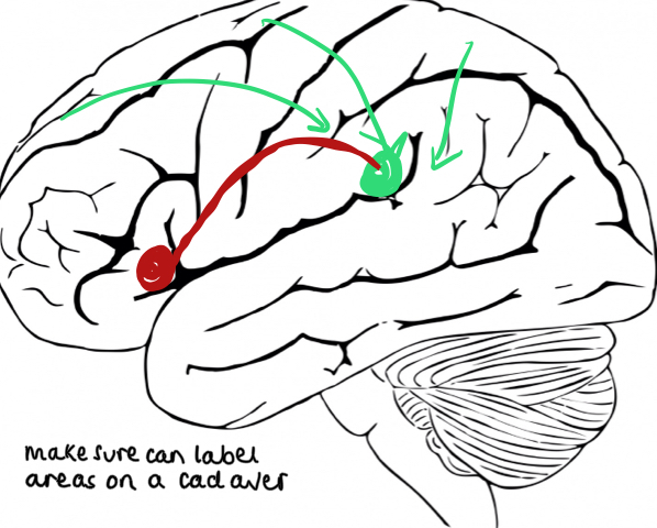 • Joined by arcuate fasiculus and then Broca’s projects to motor cortex