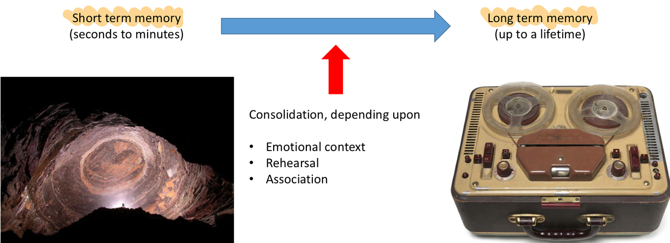 How are long and short term memories stored and what can help with consolidation of memories (conversion from short to long term)?
