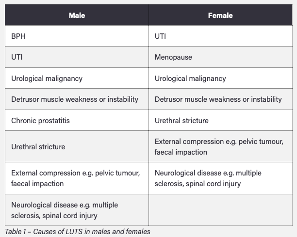 What is the aetiology of LUTS in men and women?