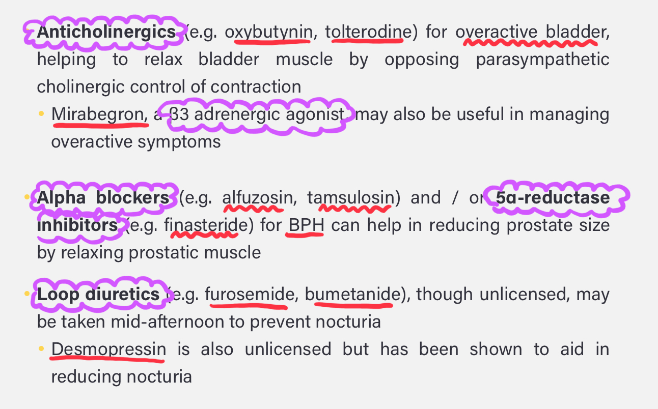 Medication: antimuscarinics, spinal anaesthesia