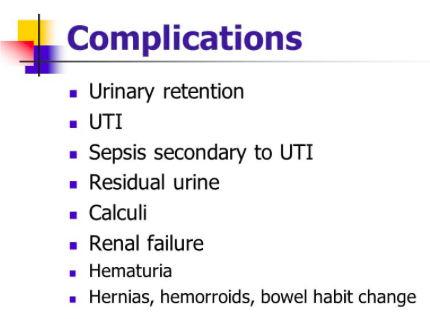 Complication: AKI, CKD, renal scarring, UTI, renal stones due to stasis