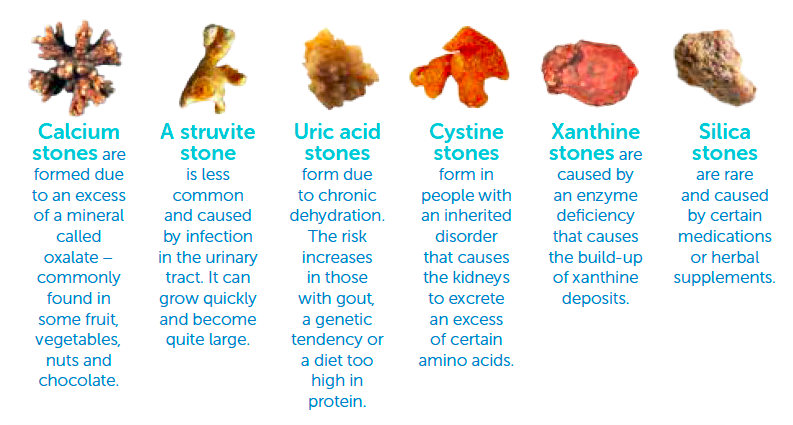 - Calcium (80%): calcium oxalate (35%), calcium phosphate (10%), or mixed oxalate and phosphate (35%)