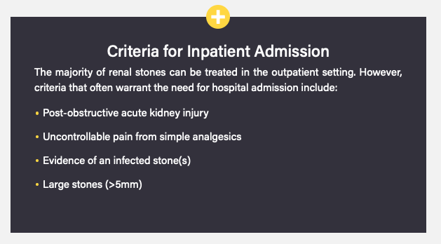 - Other imaging: AXR with IV urogram (most stones not radiolucent and high radiation exposure) or US to assess for hydronephrosis