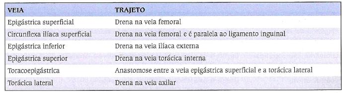 • Superiormente: V. torácica interna (med.): V. subclávia V. torácica lateral (lat.): v. axilar • Inferiormente: V. epig. Superficial: v. femoral V. epig. Inferior: v. ilíaca externa Vv. cutâneas que circundam o umbigo tributam nas vv. Paraumbilicais Tributárias da v.porta Paralelas ao ligamento redondo do fígado (v. umbilical Obliterada) • Formação da v. toraco Epigástrica: v. torácica lateral+ v. epigátrica superficial