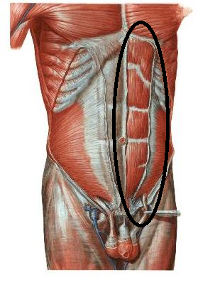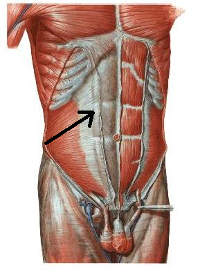 •Origem: 5ª-12ª costelas • Inserção: Linha alba, tubérculo púbico e crista ilíaca • Inervação: Nervos toracoabdominais (T7-T11) e Nervo subcostal • Ação: Flexão e torção do tronco • Sentido das fibras (colocando a mão no bolso)