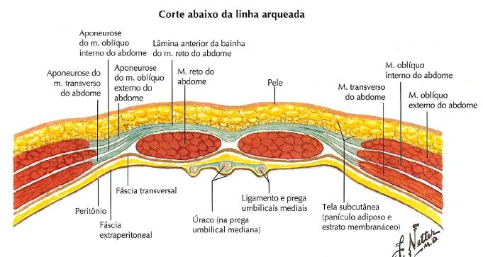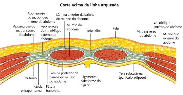 Anterior ao reto do abdome: fibras do oblíquo externo e fibras anteriores do oblíquo interno Posterior ao reto do abdome : fibras posterior do oblíquo interno e todas as fibras do transverso do abdome