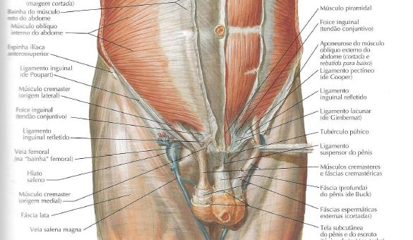 1) Fascia de camper - + superficial, um panículo adiposo 2) Fáscia de Scarpa- • Extrato membranáceo • Reforçada com fibras elásticas e colágenas • Presa ao ligamento inguinal e a fáscia lata • Espessa-se da sínfise do púbis até o dorso pênis