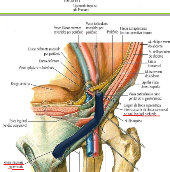 • junção de várias estruturas que, nos homens, é quem atravessa o canal inguinal e acaba no escroto (testículo). • A medida que ele vai passando pelo canal, ele vai ganhando bainhas de cada camada da parede abdominal (região inguinal) que ele passa, e elas continuam com o funículo para o escroto. Me refiro a